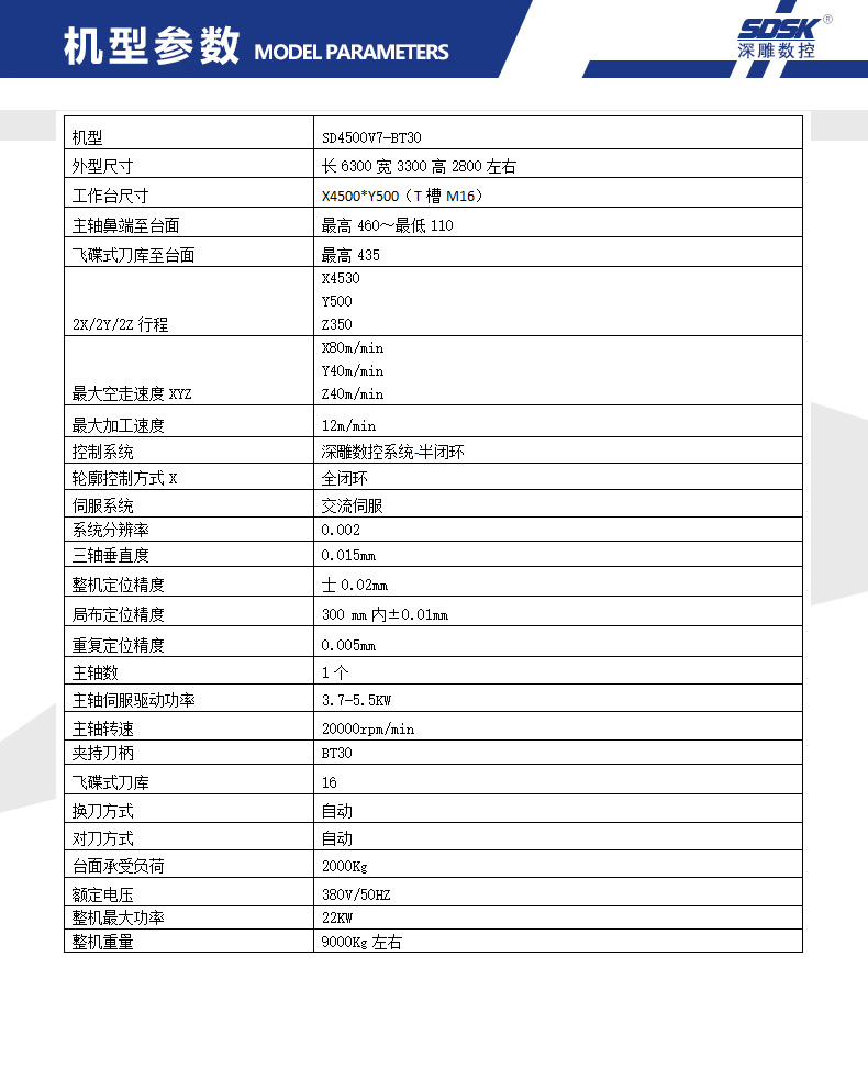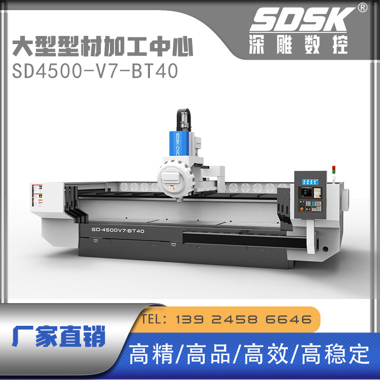 1. The SD4500V7-BT40 model series is a large-scale profile machining center specially designed for customers; Crown block structure; The three-axis motion mechanism is designed at the top of the crossbeam, which is lightweight, convenient, and easy to clean. The Y-axis head moves forward and backward, the X-axis head moves left and right, and the Z-axis spindle moves up and down< Br/>